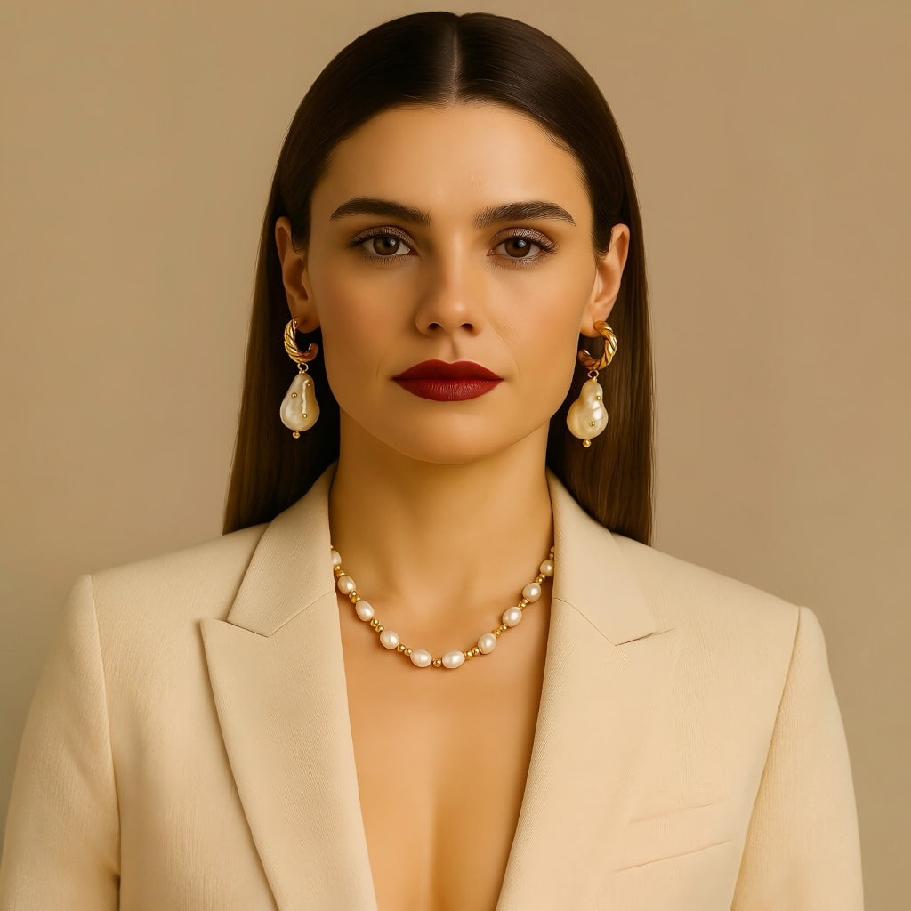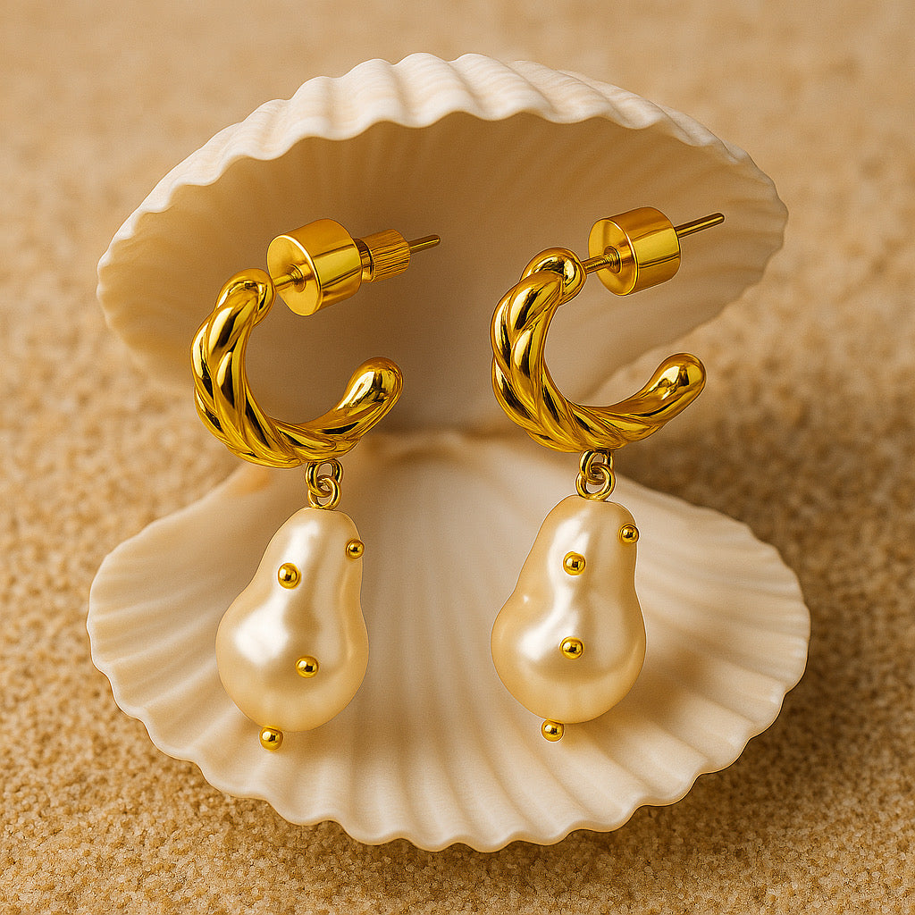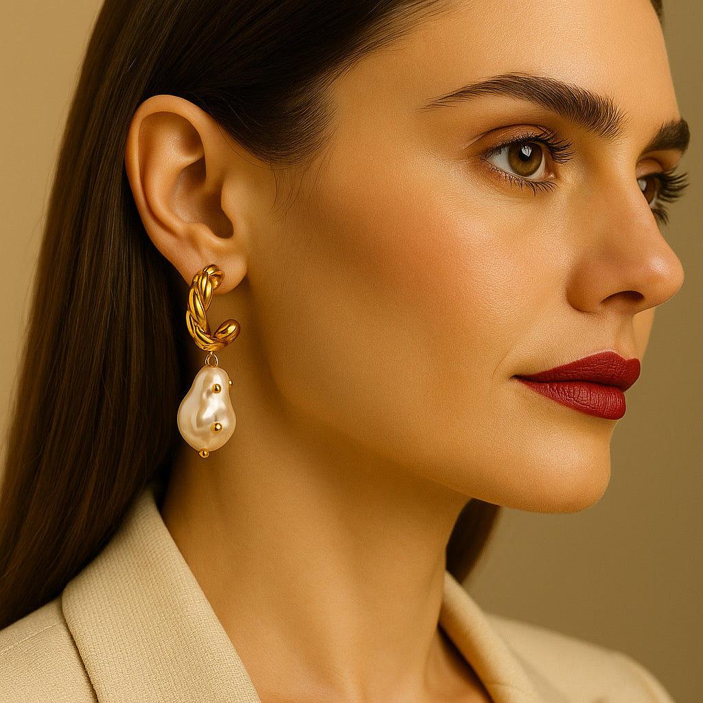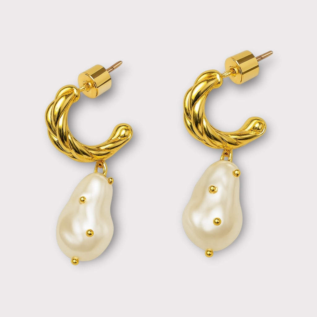 The Aurora Baroque Drop Earrings blend classic sophistication with modern design. Featuring twisted 18k gold-plated hoops paired with distinctively shaped artificial baroque pearls, these earrings offer a refined touch of luxury. Their lightweight construction ensures comfort, making them an ideal accessory for both daily wear and elegant events. These earrings embody understated elegance with a contemporary edge.