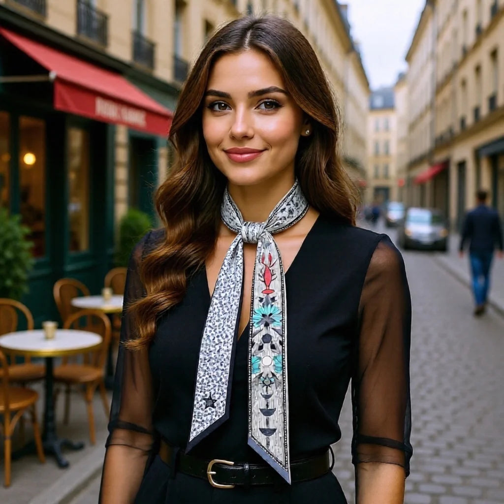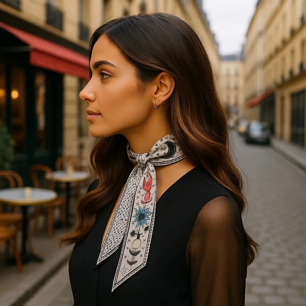 Elevate your accessory game with this versatile silk-blend scarf. Wear it as a chic hair tie, neck accessory, or wrist detail—the Celestial Twilley adapts to your style. Soft, lightweight fabric drapes beautifully without slipping, making it perfect for both everyday wear and special occasions. A timeless piece that works as hard as you do.