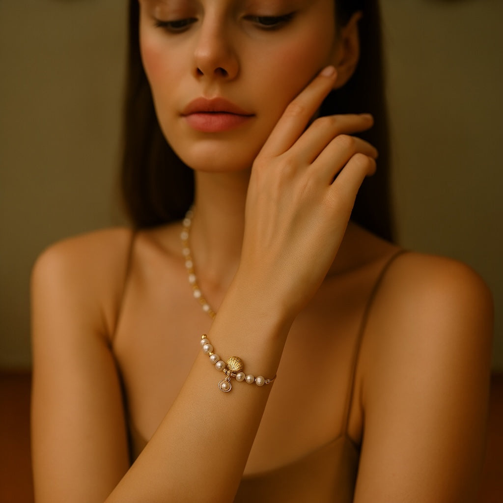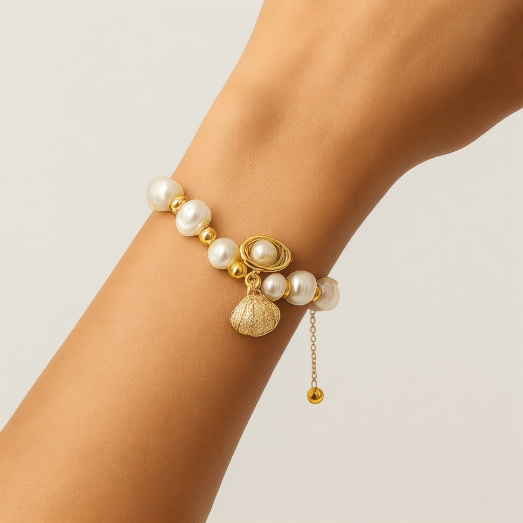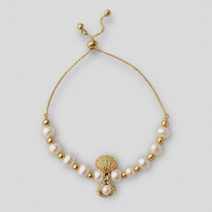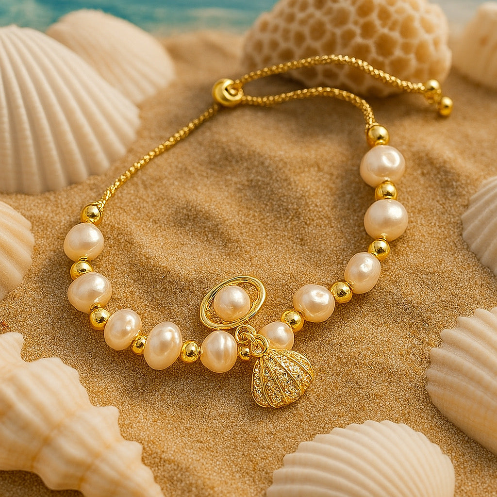 Embrace the tranquil beauty of the sea with the Eclat de Coquillage Bracelet, expertly crafted from natural freshwater pearls and highlighted by luminous 18k gold plating. Featuring a delicate shell charm embellished with sparkling zircon crystals, this piece reflects the subtle shimmer of sunlit seafoam. A distinctive creation from PaulaB, it brings a sophisticated coastal elegance ideal for both daily wear and beachside occasions.
